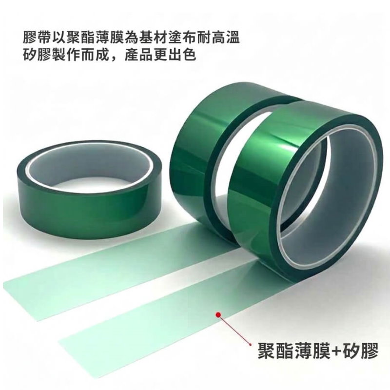 PET 綠膠帶是以 PET 聚酯薄膜為基材,搭配 耐高溫矽膠黏著劑製成的高性能遮蔽膠帶。其具備: