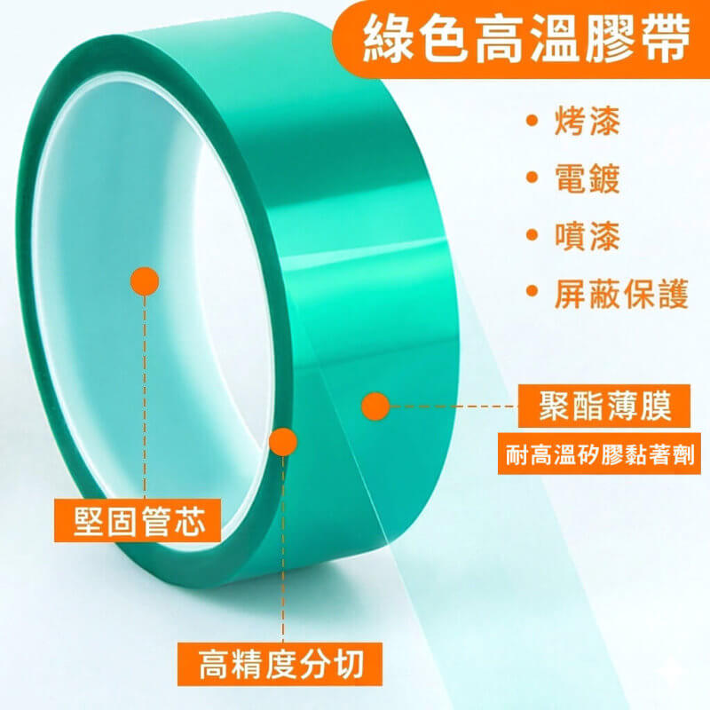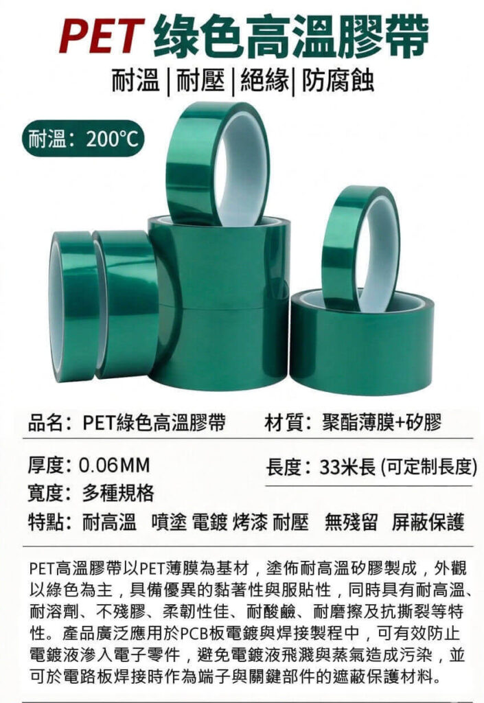 PET 綠色耐高溫膠帶(PET High Temperature Masking Tape)即為因應此類高規格需求而開發的重要工業耗材。