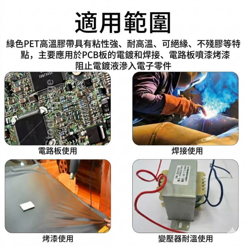 PET 綠膠帶可短時間耐受約 180°C~200°C高溫環境,適用於: